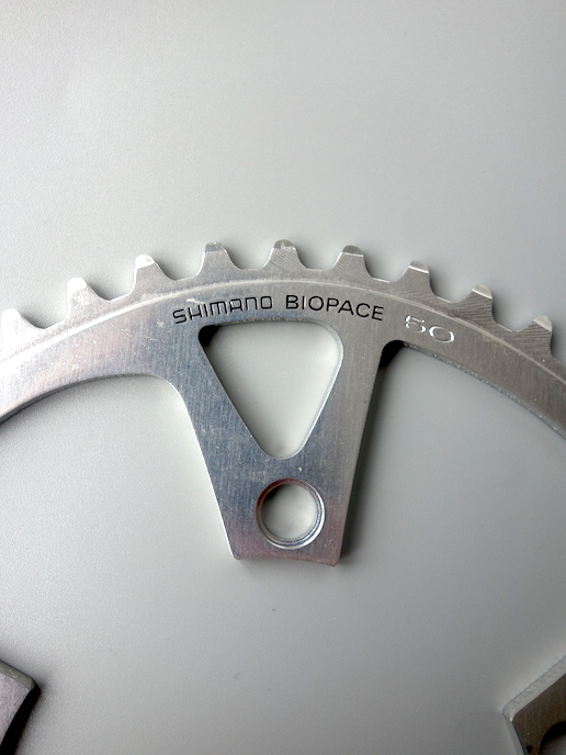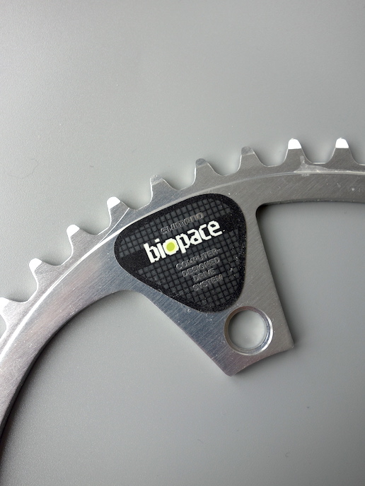 These BioPace rings are nicely finished in a clear high shine alloy and feature a wonderfully futuristic BioPace decal that looks like it was made on a Spectrum. The 50 tooth outer ring is pretty punchy, but it was only available in 50 or 48 so I guess everyone was tougher back then! As far as I can tell these were discontinued/replaced in 1987, however these rings carry a 1988 date code, I guess they continued to make some spares for a little while.