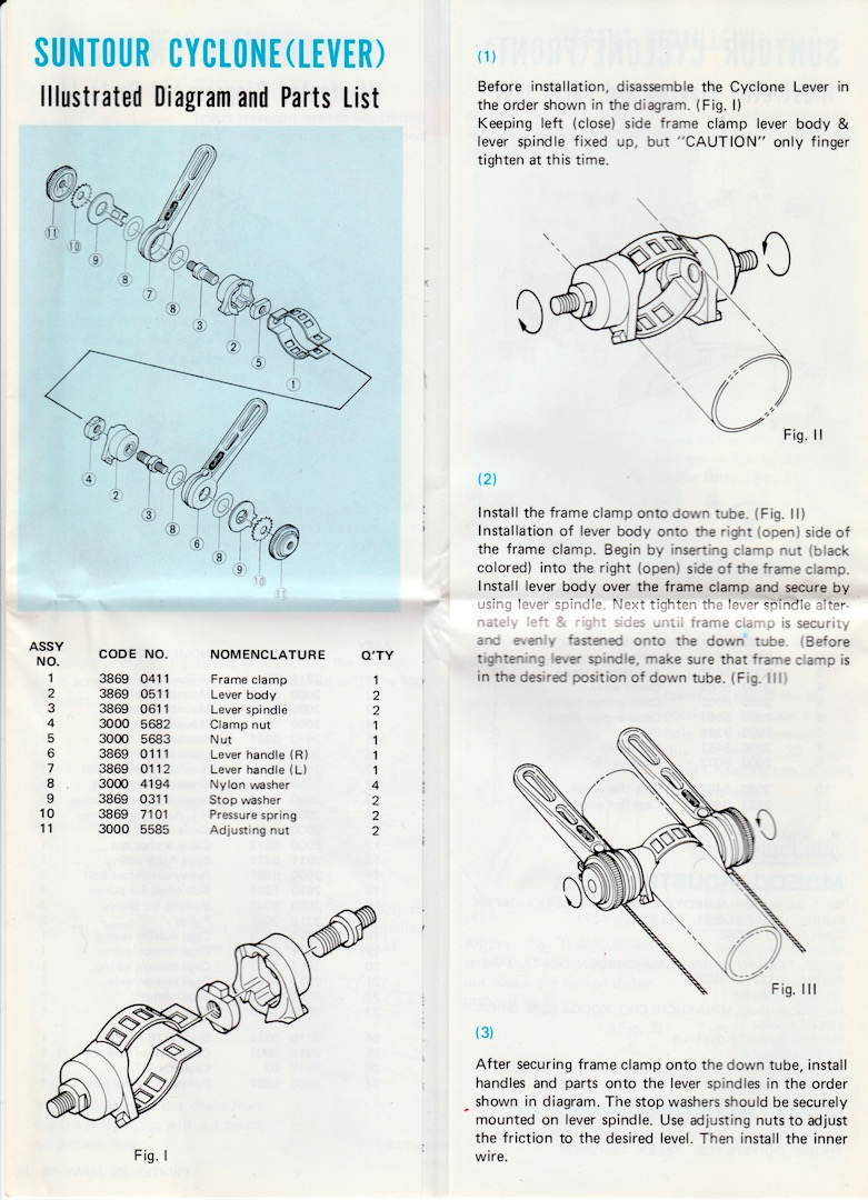 Beautifully finished Suntour Cyclone shifters, these being the second generation of the Cyclone group and the lightest shifters available in the mid 70s. With their ingenious endless clamp system and milled out levers they look fantastic and offer Suntour’s typical attention to detail and finish. Both levers are friction and can be adjusted on the go with large thumbnuts for tension.