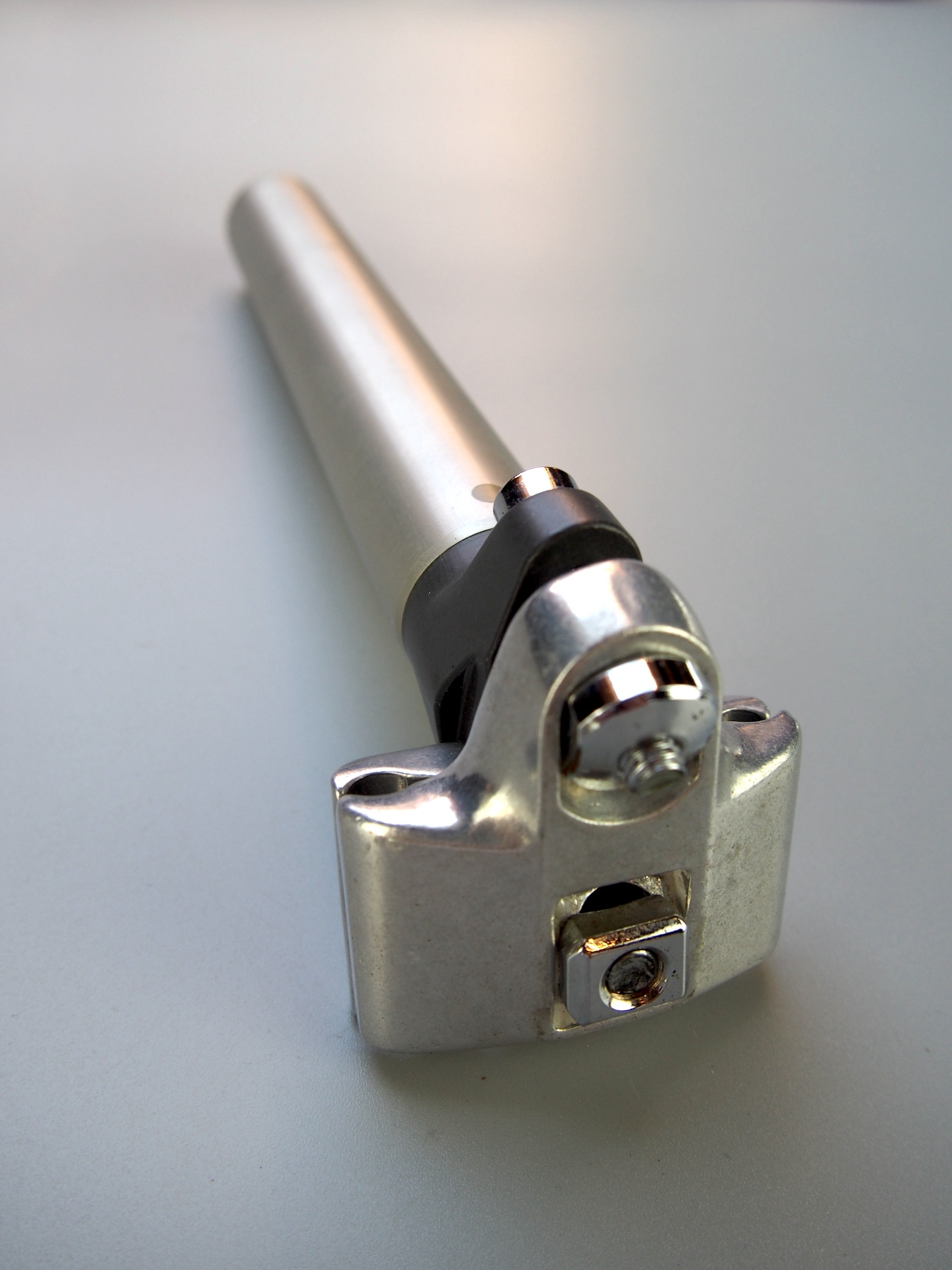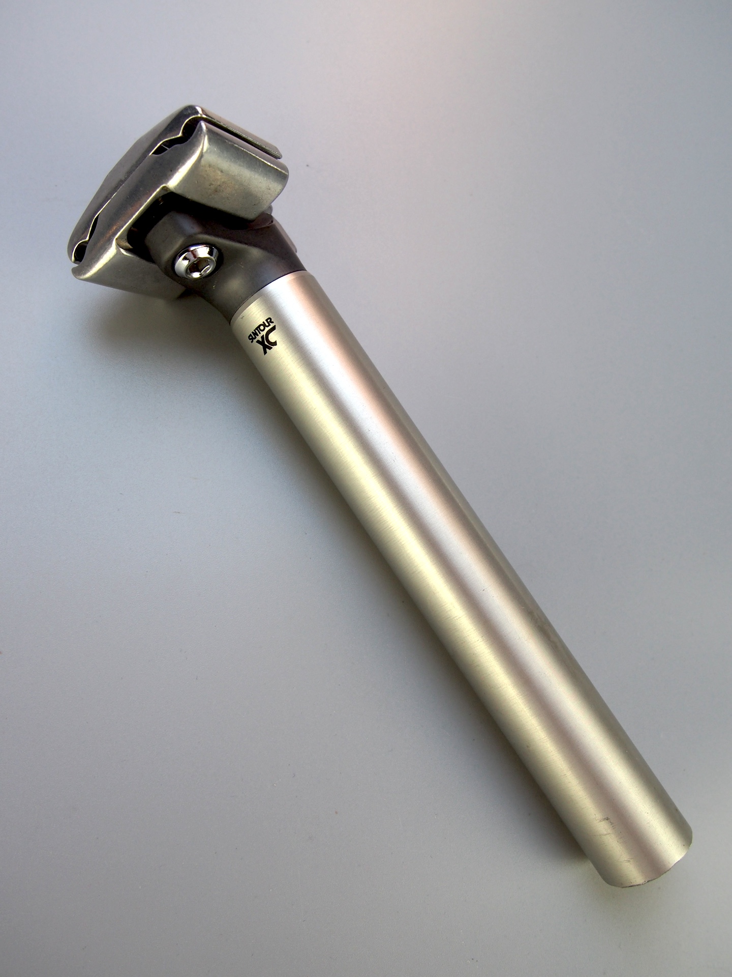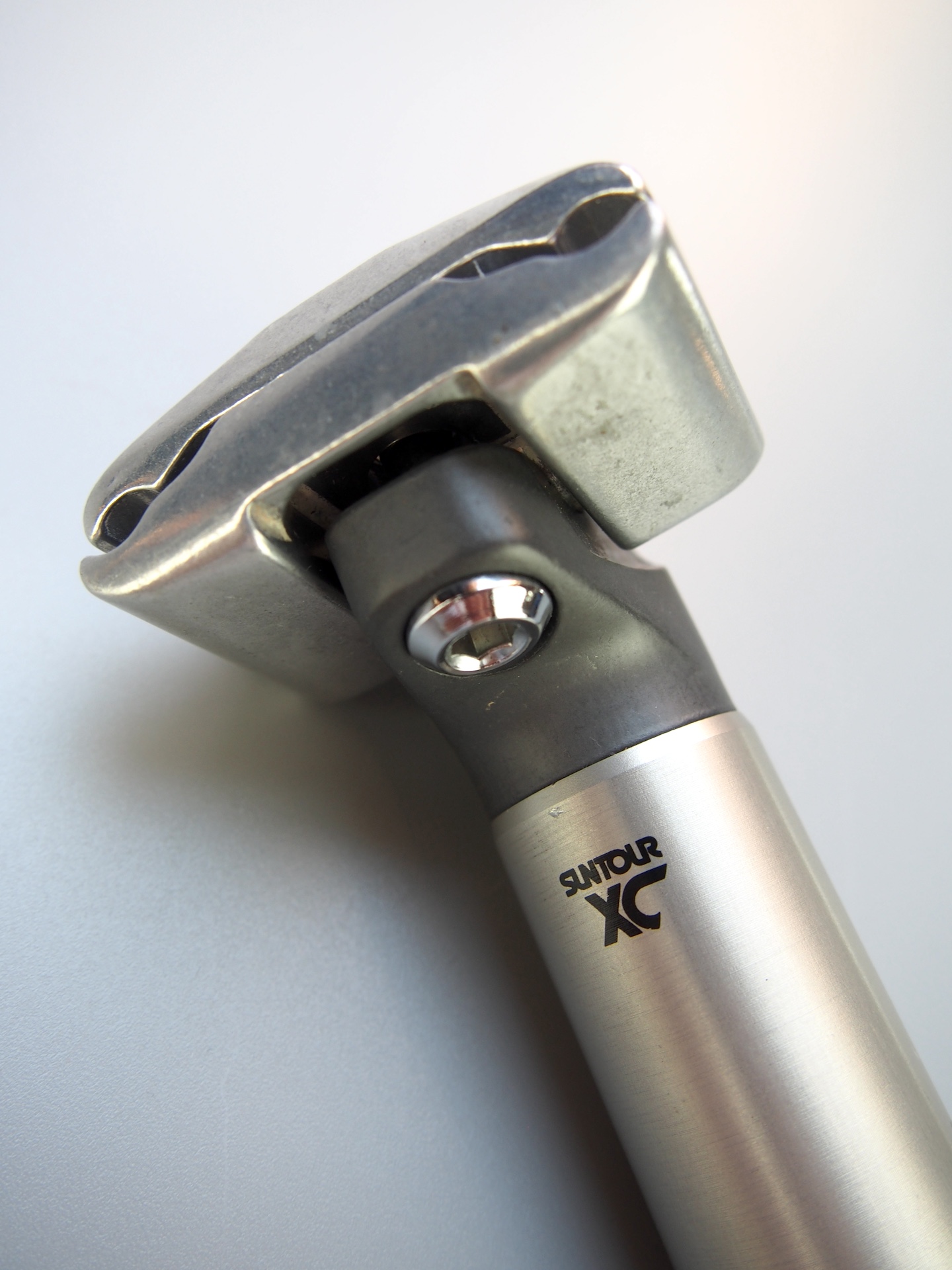 Quite rightly a classic, the Suntour XC 9000 seatpost was beautifully finished, precisely engineered, worked faultlessly and looked good. This seatpost design was available for a long time, later with an updated logo. They were deemed so good that renowned tinkerer Charlie Cunningham used to make his own extra-long, over-sized version to suit the WTB phoenix by transplanting the head onto a wider, longer aluminium tube.