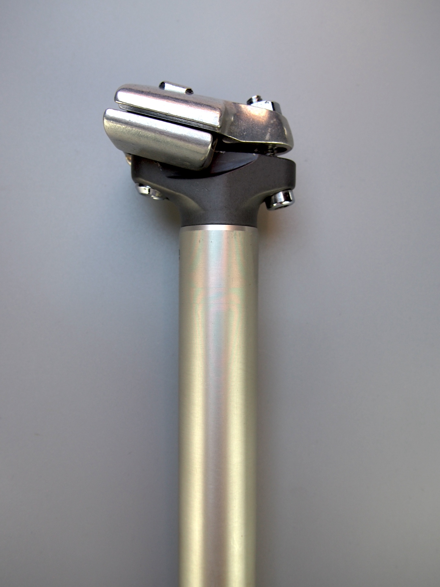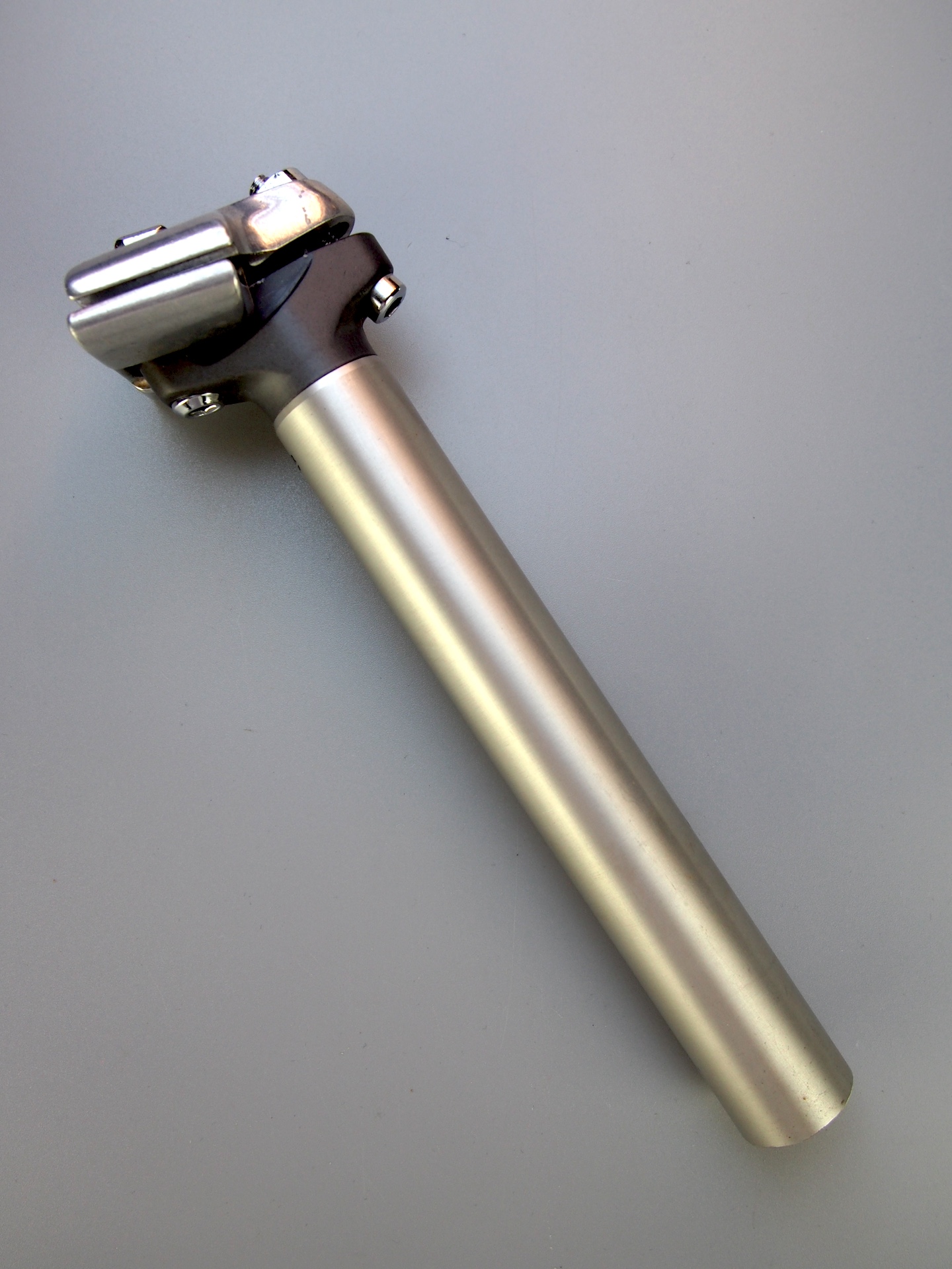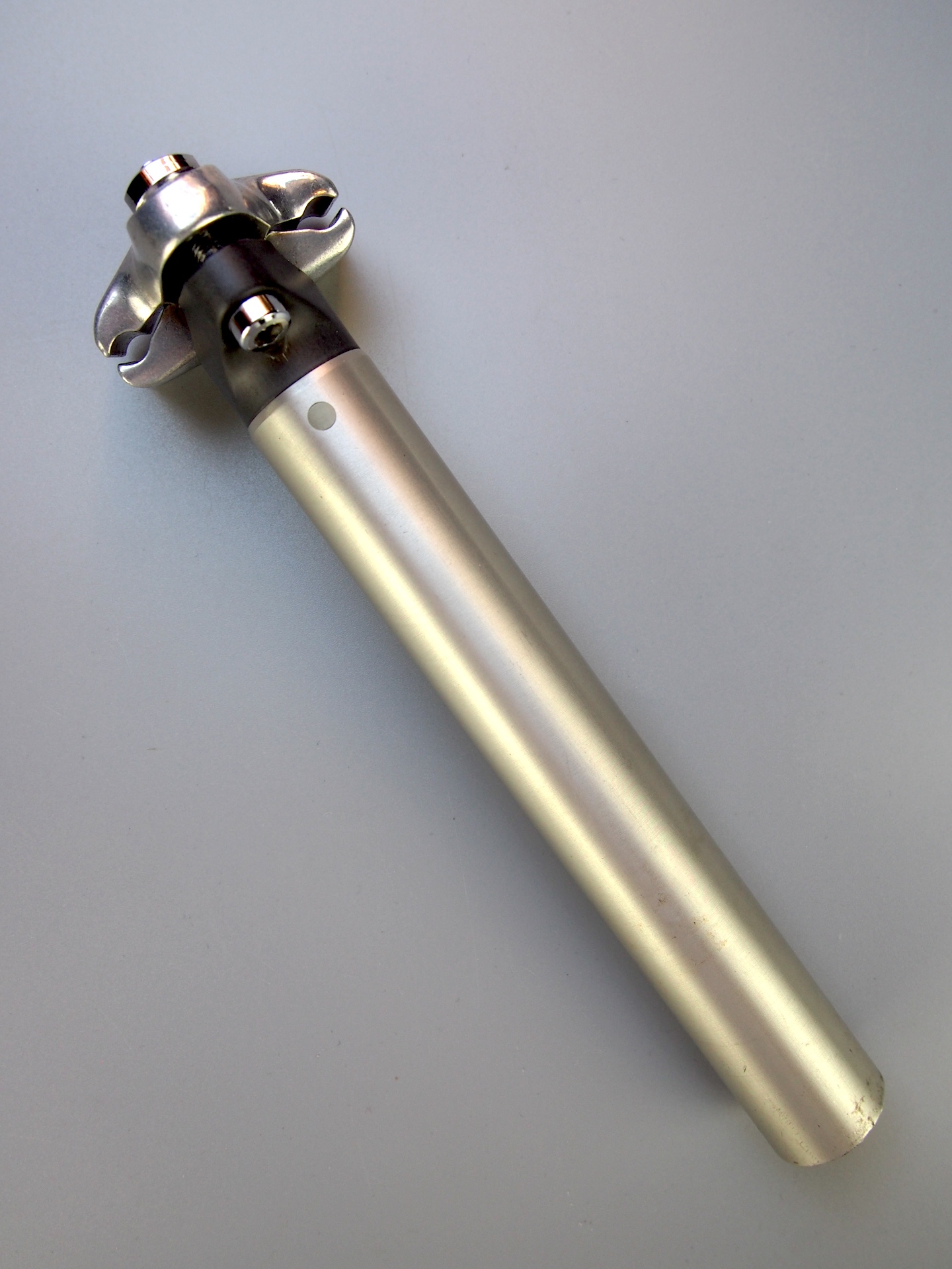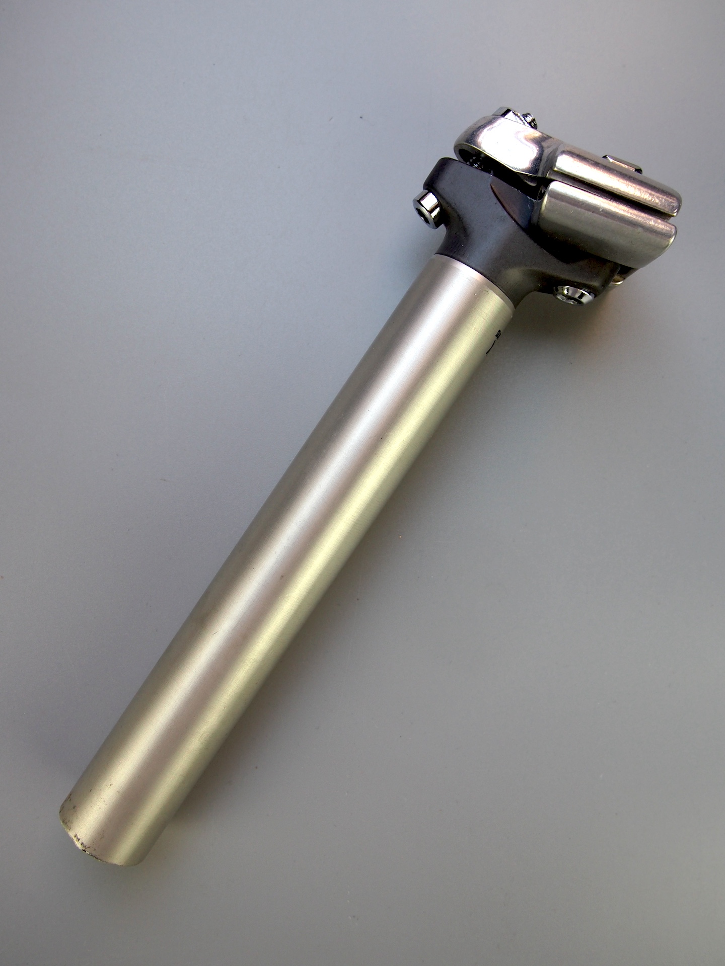 Quite rightly a classic, the Suntour XC 9000 seatpost was beautifully finished, precisely engineered, worked faultlessly and looked good. This seatpost design was available for a long time, later with an updated logo. They were deemed so good that renowned tinkerer Charlie Cunningham used to make his own extra-long, over-sized version to suit the WTB phoenix by transplanting the head onto a wider, longer aluminium tube.
