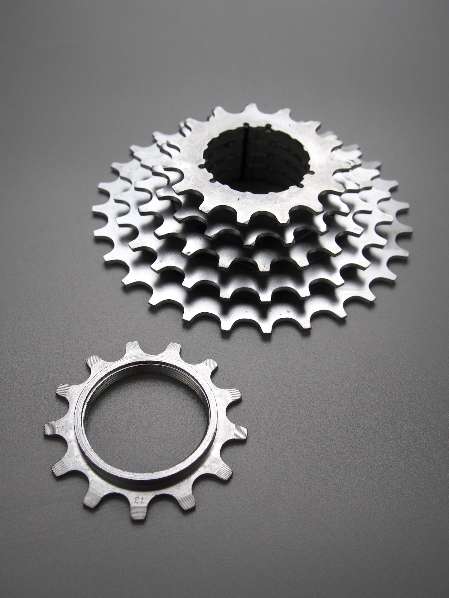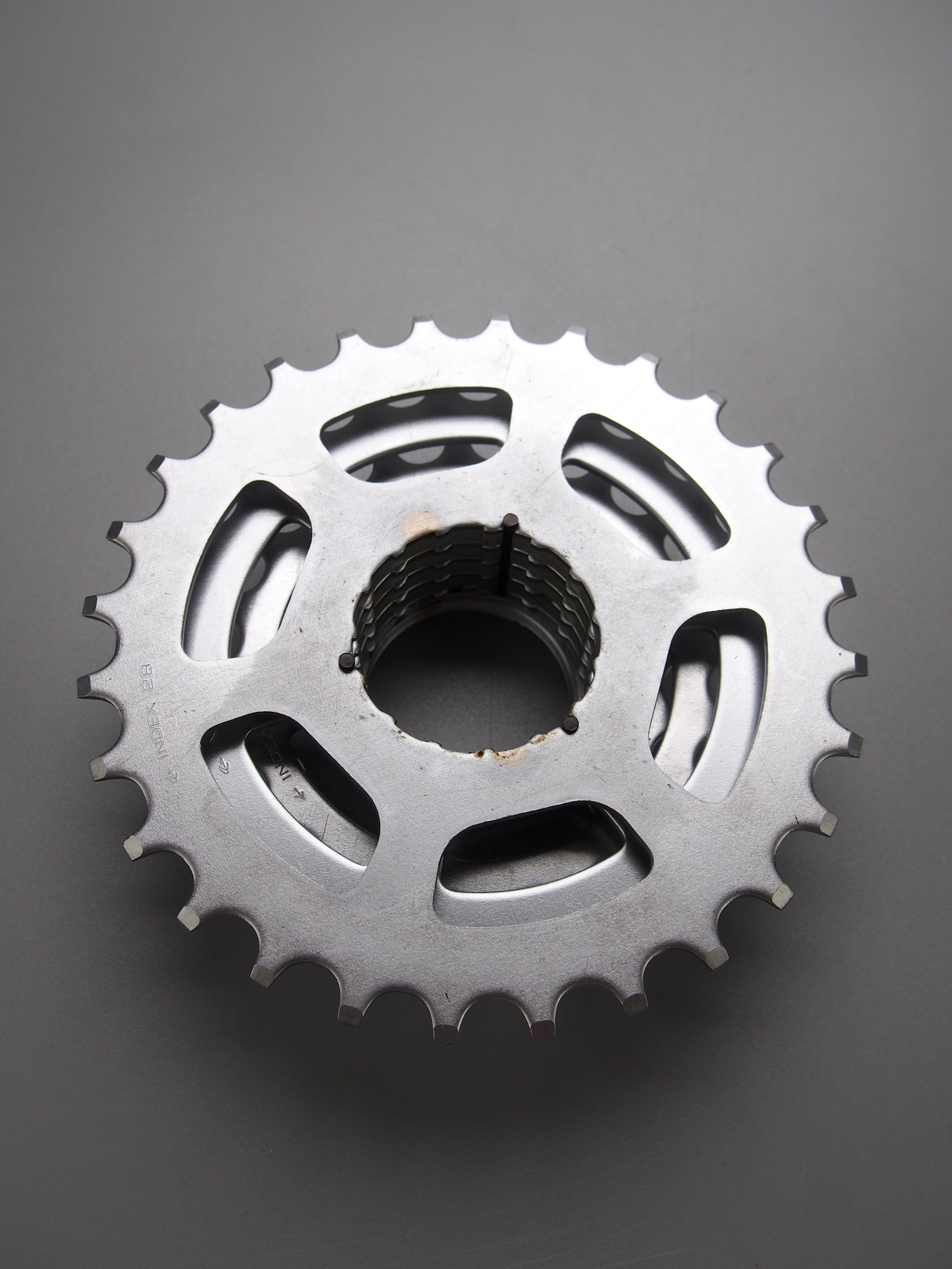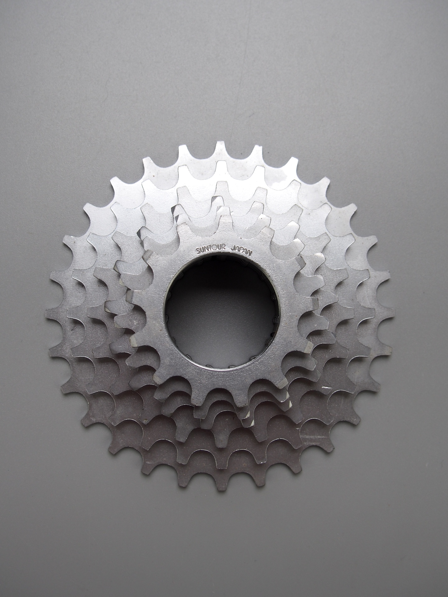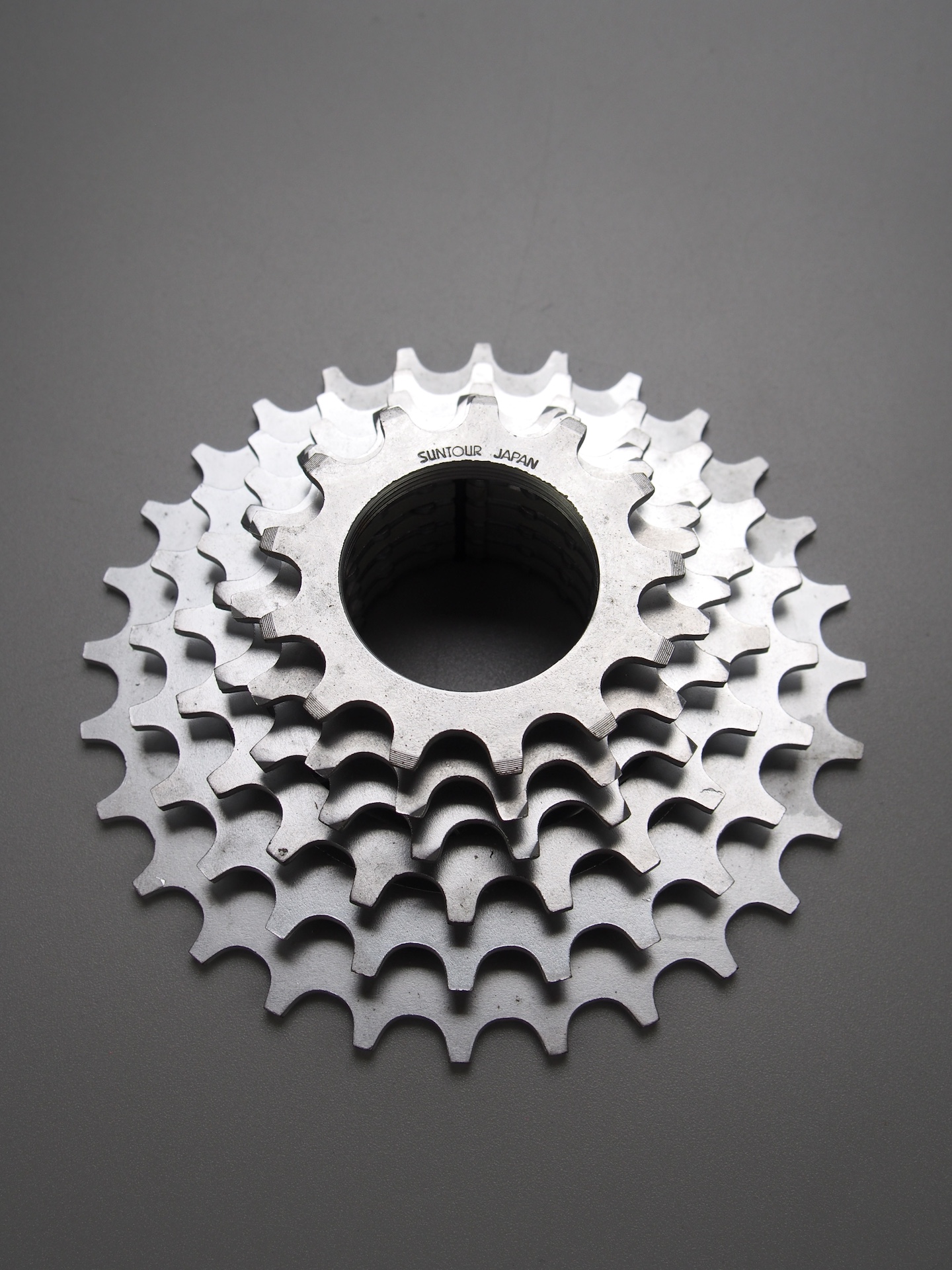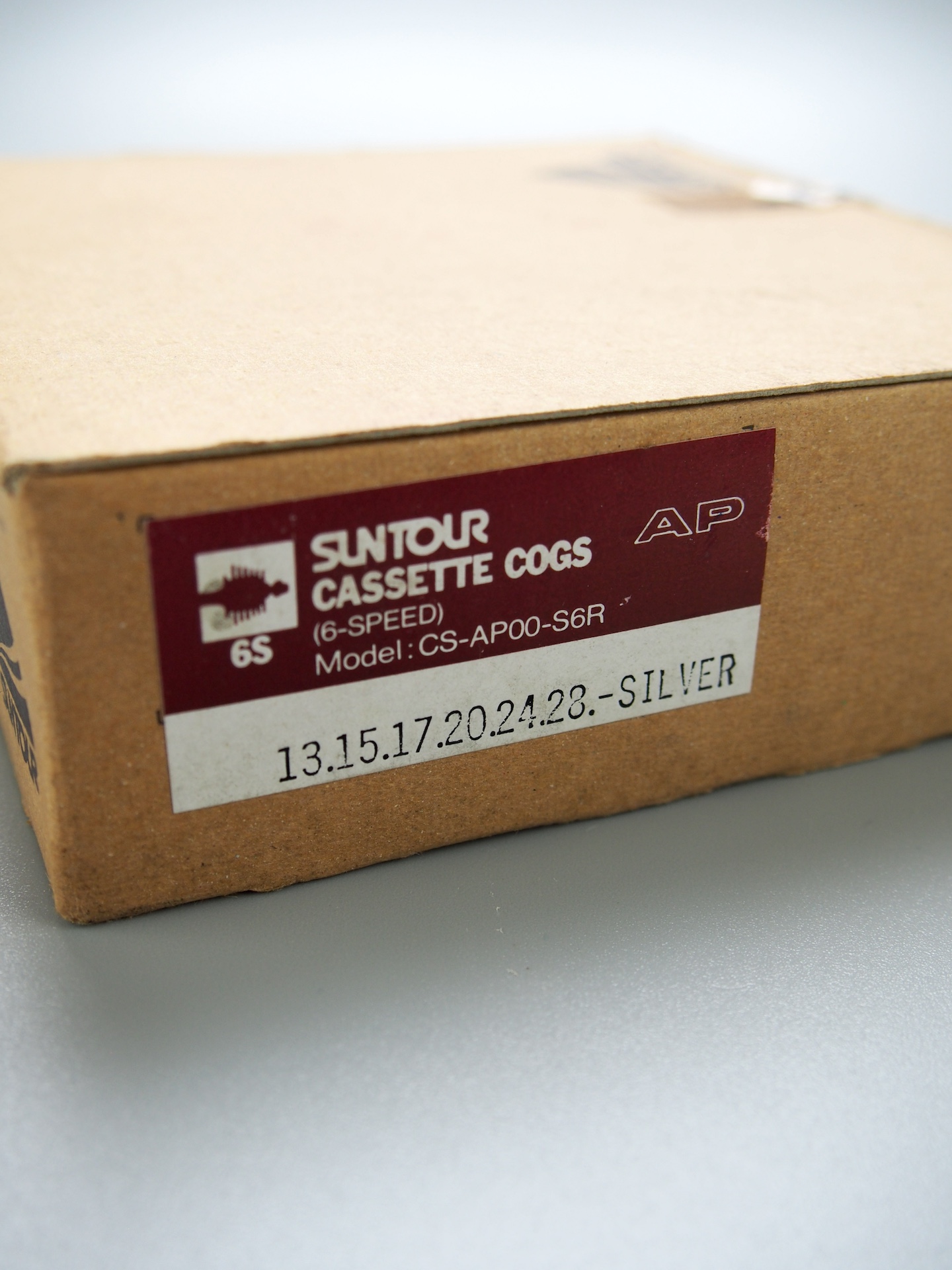 Suntour specific 6 speed CS-AP00-S6R cassette with one threaded sprocket for Suntour’s proprietary freehub design, from the 1990 XC Pro and XC Comp MTB groupsets. This freehub and cassette design was new for 1990 and only appeared on the top end groupsets, we have these cassettes available with a 28, 30 or 32 tooth largest sprocket. Although constant innovation was part of what made Suntour great it was key to it’s downfall with an over-complicated number of specific cassettes, chains, derailleurs and shifters across road and MTB groups that weren’t inter-compatible and were updated yearly!