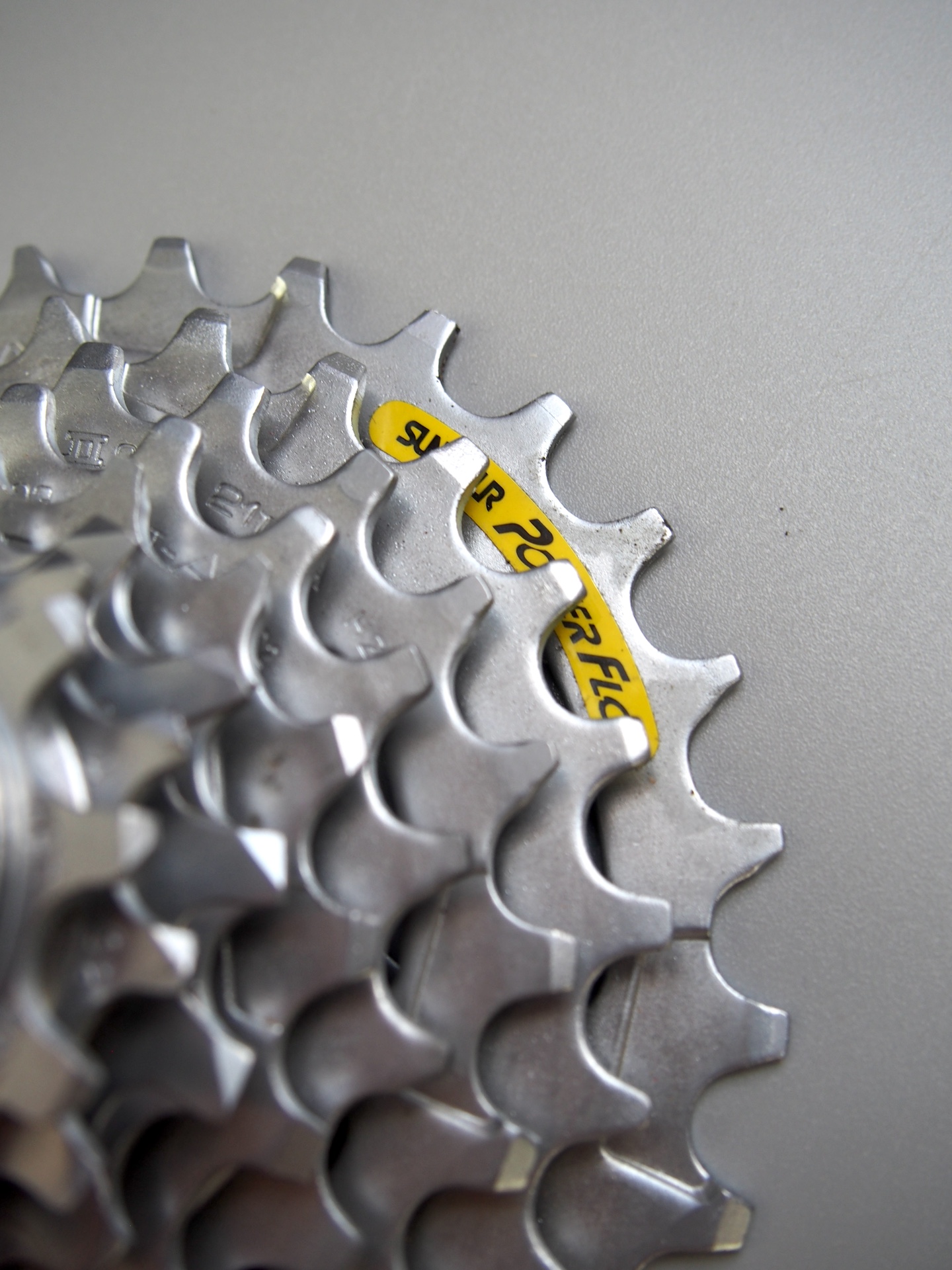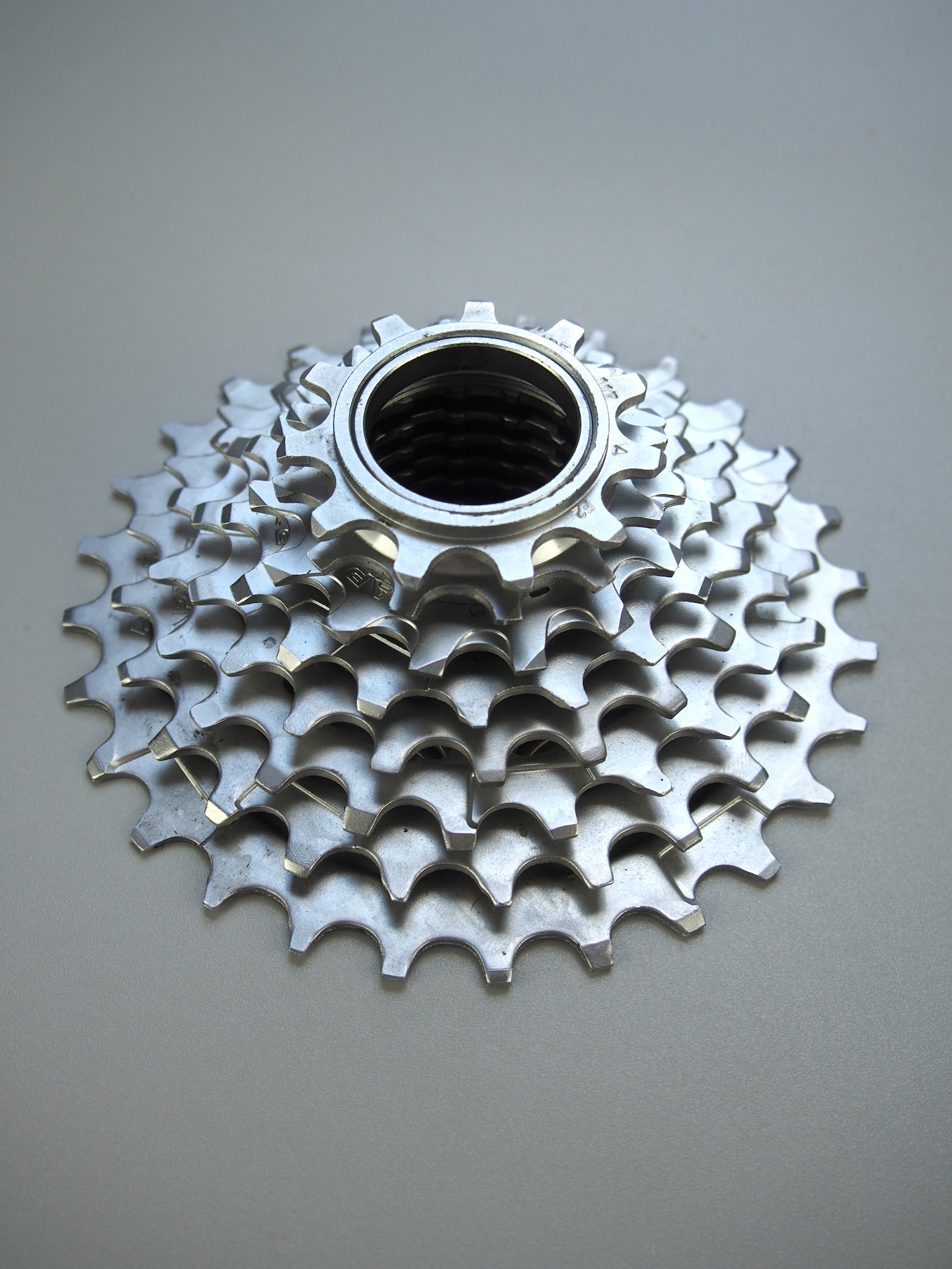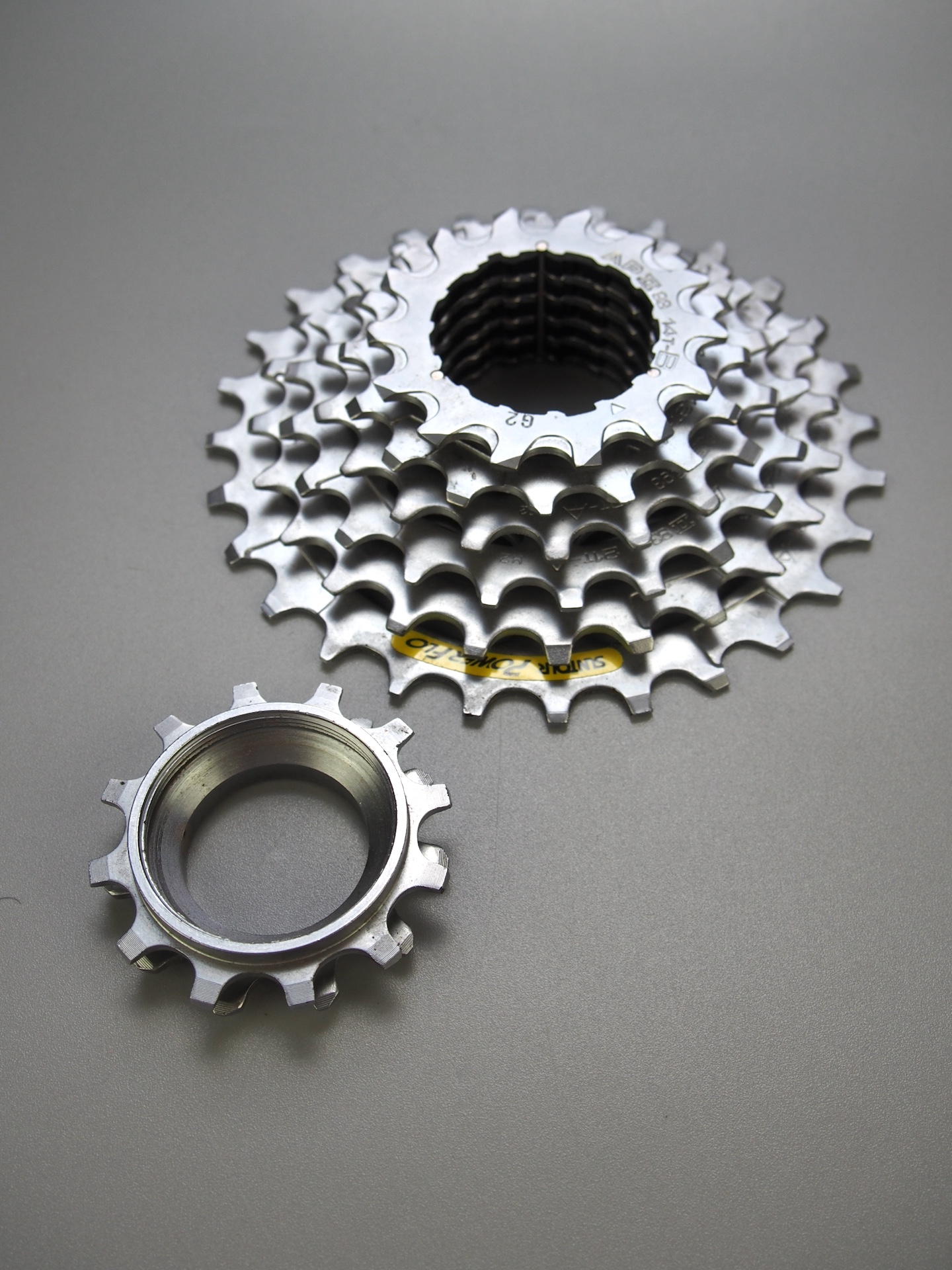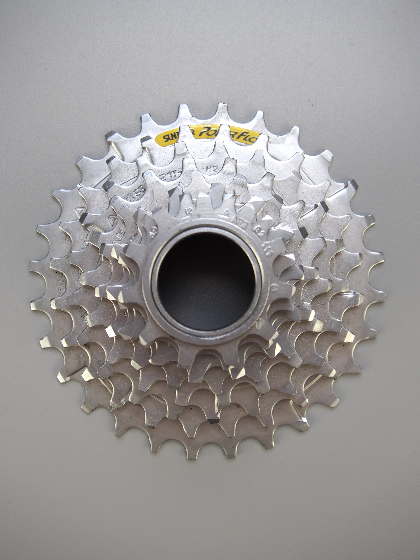 Suntour specific 8 speed Micro Drive CS-AP20-S8 (MD) cassette with two threaded sprockets for Suntour’s proprietary freehub design. 1993 was arguably the last great year for Suntour, it saw the introduction of 8 speed Micro Drive for the XC Pro and XC Comp groupsets utilising a double threaded sprocket to get the lower tooth count. Although this constant innovation was part of what made Suntour great it was key to it’s downfall with an over-complicated number of specific cassettes, chains, derailleurs and shifters across road and MTB groups that weren’t inter-compatible and were updated yearly!